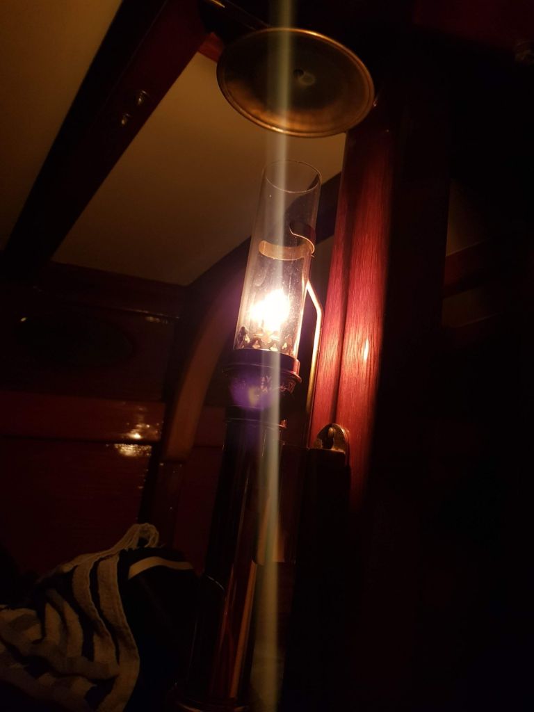 The boat has two berths and although there’s only limited height inside the cabin it’s enough for camping for a few days. The light of the oil lamp in this last shot finishing a busy day off before a good night’s sleep.