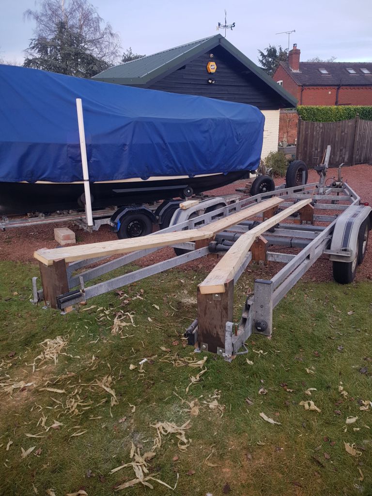 This new trailer has a ladder frame. The rollers are arranged in four pairs in straight horizontal line. To get the rollers to marry up to Tarka’s slightly curved long keel, I made some measurements and calculated that the foremost and aftmost pair needed to be raised by two inches. In addition these needed to be converted to make them wobble in order to get all rollers to contact the keel and provide the same support.