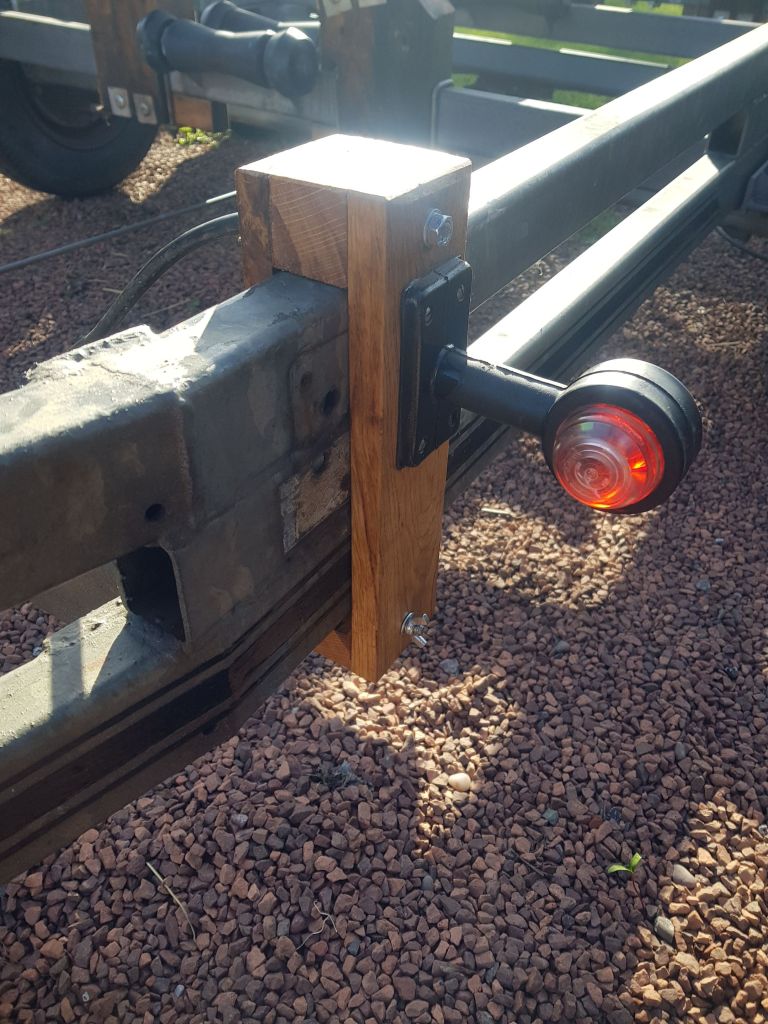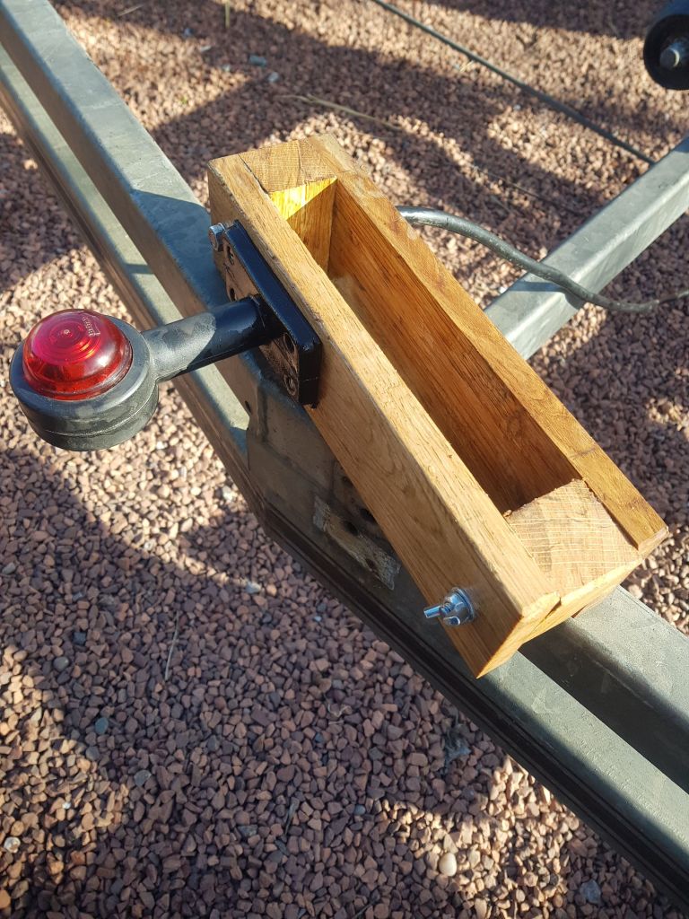 Adding removable marker lights was a challenge. I didn’t want to end up with a fixed loom with spurs hard wired onto the main cable and markers. That way the whole removable setup would have been hard to manage on and off the trailer. So making the setup manageable meant having sections that could be disconnected quickly. I decided to mount the markers on wooden brackets, and turned one of the brackets into a junction box containing a seven gang outlet.