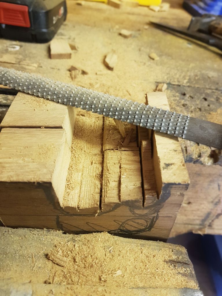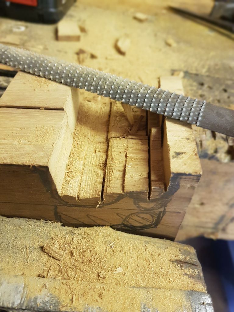 And so onto the finishing touches. Rounding and remaining corners and edges to prevent snagging and chafing any rigging. Final cleanup with sandpaper and a first coat of linseed oil mixed with white spirit.
