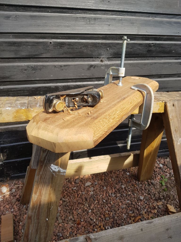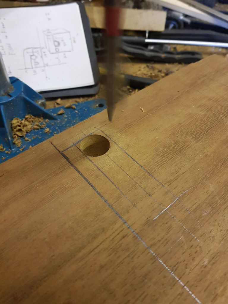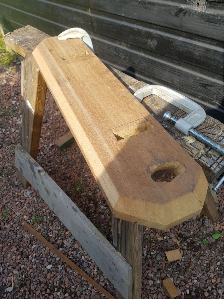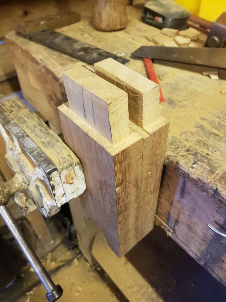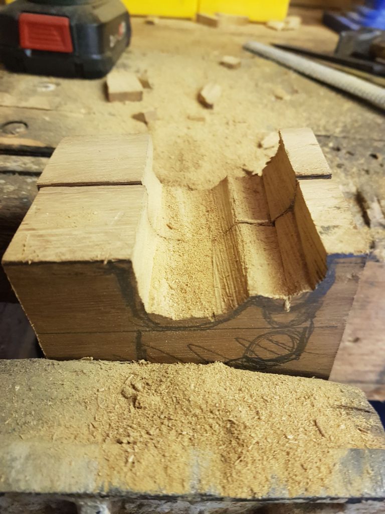 I started with a nice thick piece of iroko to build the anchor bearers. I’m starting with two 4in square blocks and proceeded to shape them out to receive the main bar and folded cross bar.