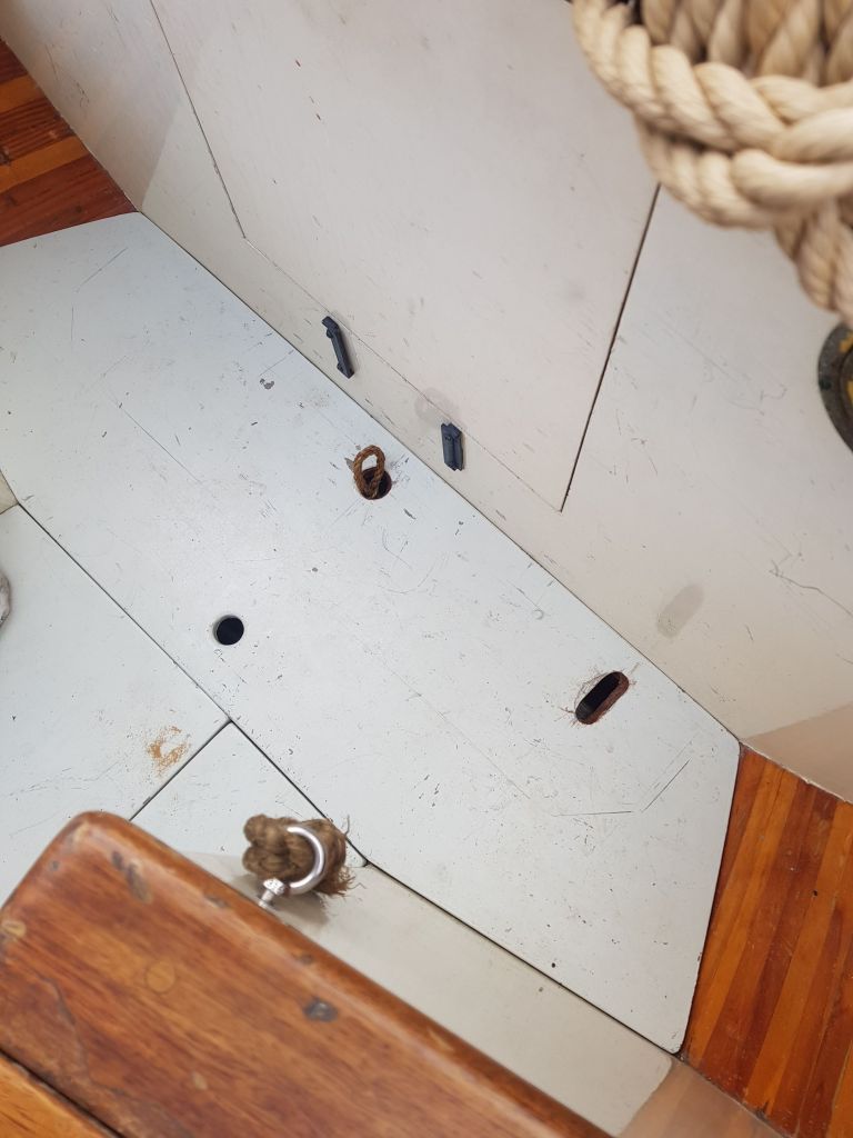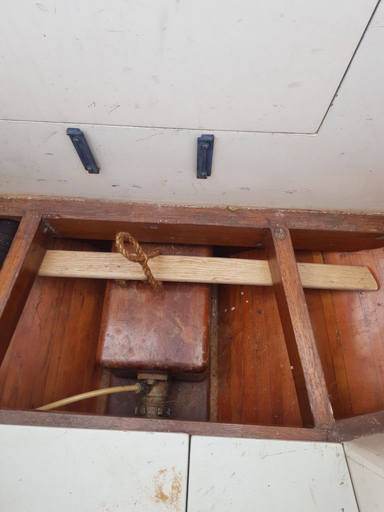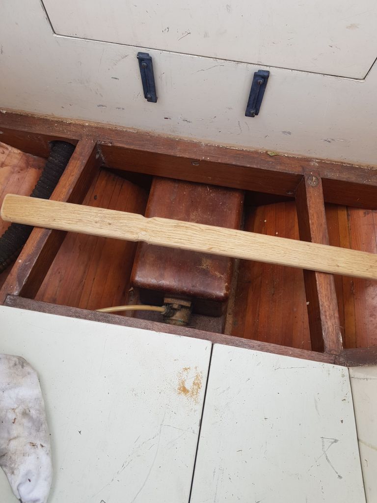 Inspiration arrived! Without altering any of the woodwork on the boat itself, and with only the addition of a 25mm hole in the floor panel, an oak brace runs underneath the frame passing through a loop of rope. The then loop passes through the 25mm hole in the floor and presents itself as an eye through which a shackle or some other fixing can be added. Onto that fixing a lashing can be made over the anchor shaft to hold the entire assembly secure down to the frame of the boat.