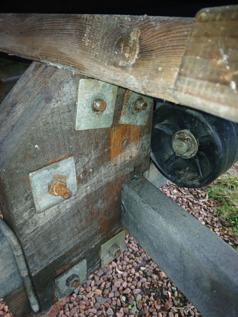 The shortened frame will support a new cross member (blue). Mounted in the middle is a single v roller (purple). The roller will lift and centre the hull during retrieve, and being positioned an inch or two below the keel when fully loaded, provide a lower point of contact for a wedge (green) that when rammed in between the keel and roller, will provide support during road transport for the keel as currently the boat overhangs about 3 foot, this will reduce the overhang to about 1 foot.