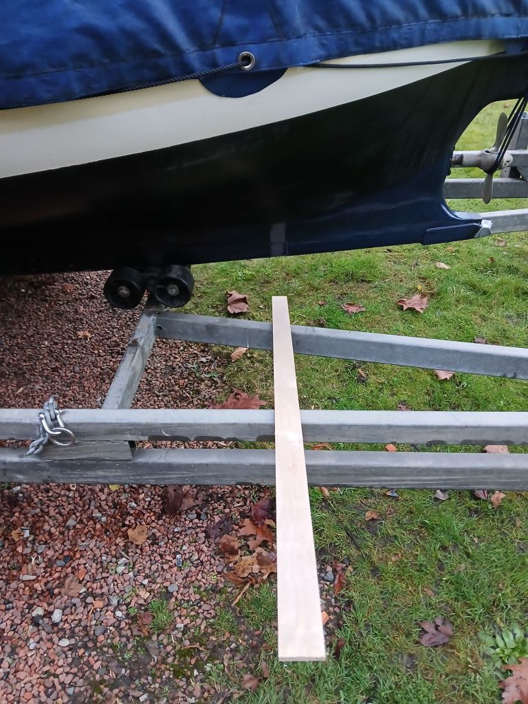 Instead of shortening the trailer straight away, I adapted this cutout to create a wooden vee guide to protect the hull from those metal parts, and hopefully provide an underwater guide for the boat that might help during launch or retrieval.
