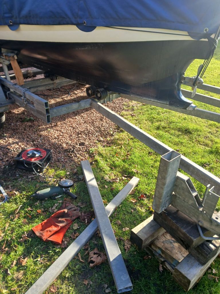 After deliberating on what cuts to make, where, and what to end up with, work begins. I decided to keep the end brackets more or less intact and reposition at the revised trailer end.
