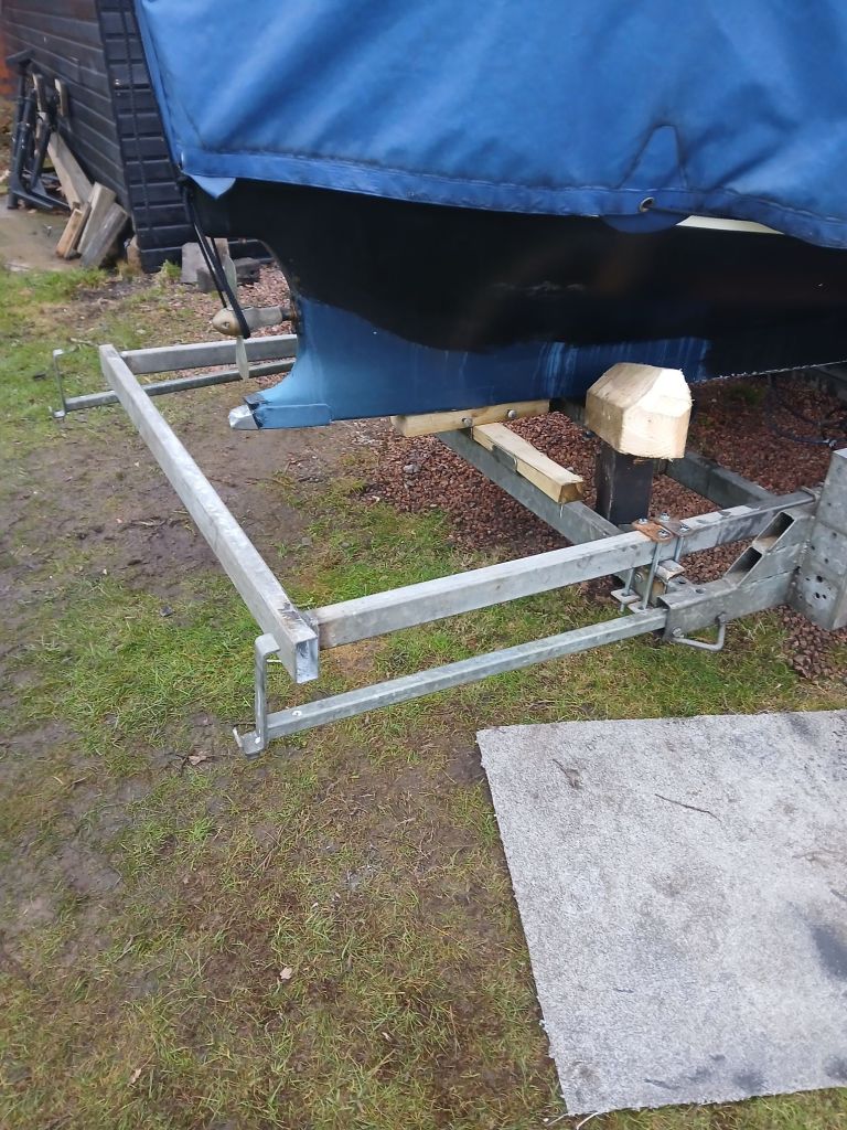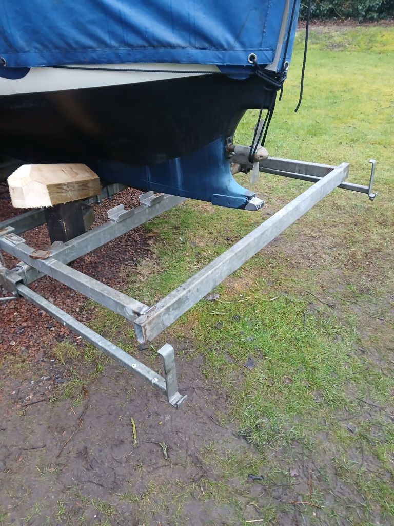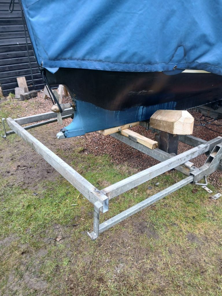 Moving Tarka up to her summertime home at Glasson Sailing Club later this week so last minute preparations for the trailer. I have to glue up the wooden vee guide and install. Then install the removable cross member and add wedges under the stern. And now I have a new challenge, to make a rear bumper to protect the stern during transit.