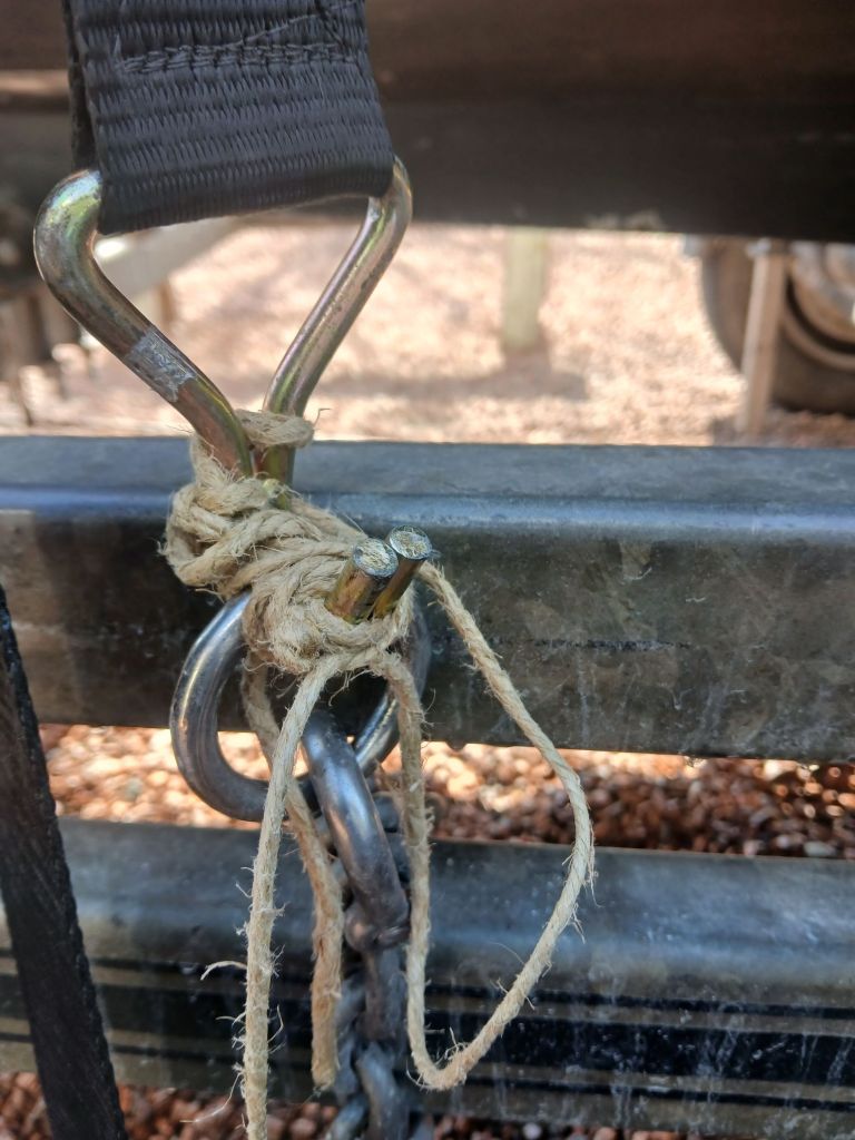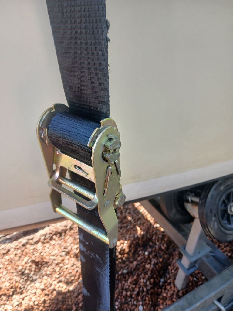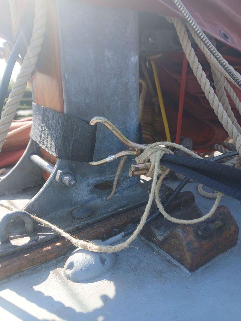 Since the hull rests against two pairs of wobble rollers mounted on brackets each side the keel to keep the boat upright it is necessary to lower these rollers to get access to sand or paint the areas of the hull they they engage with. Before dropping the rollers out of the way I lashed the mast tabernacle to the side of the trailer opposite to the side the rollers to be dropped with a ratchet strap to prevent the boat accidentally toppling over. The string you can see in the photos is simply a precaution. I moused the hooks with some hemp cord to prevent anything coming undone before the ratchet was tightened. Belt and braces maybe but better with than without. The world, they say would be utter chaos without a bit of sting here and there.