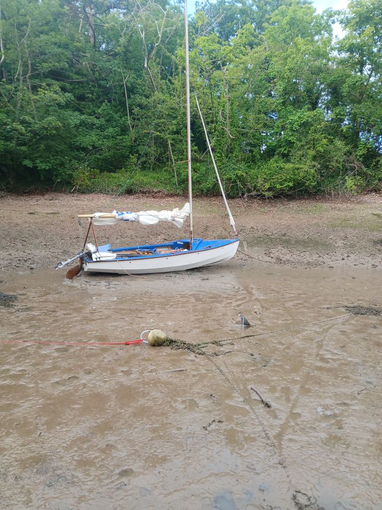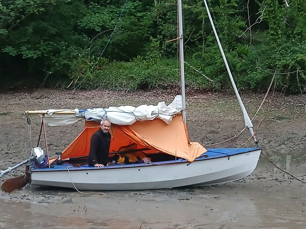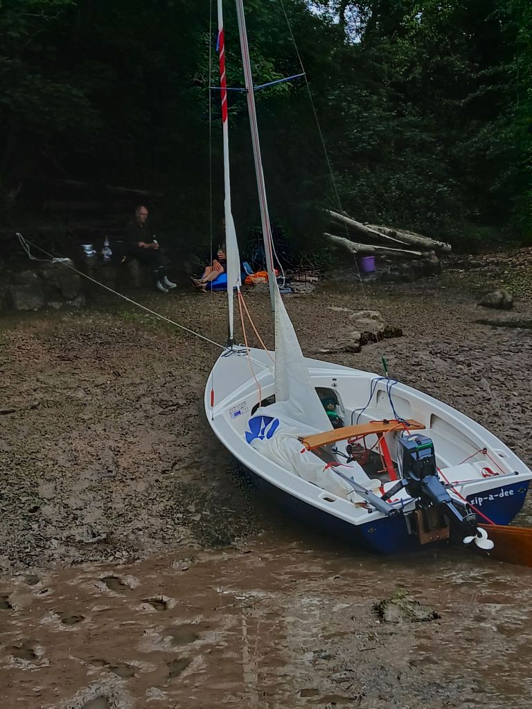 The short cruise to the quarry meant there was plenty of time for going ashore for a walk around the quarry, or for dozing, eating, sharing stories, and for me, playing a little music on the banjo. The new blow up dinghy proved useful for a short time while there was water under the boat, but it soon became evident that all the water would drain out of the quarry and if I lingered on shore too long I would be faced with a very muddy walk back. So I paddled back and stepped back on board Tarka and resigned myself to stay on board for 24 hours.
