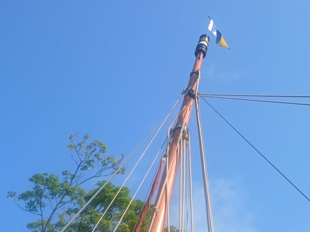 While there was water available I tried out the yuloh again and found the extra handle I added recently worked very well. I practiced turning to port ons starboard and even a little reversing, now possible since adding a latch on top of the oarlock, this being made of rope embedded inside a leather cover, which when lashed to the oarlock then forms a circular oarlock instead of a u-shaped oarlock that prevents the yuloh accidentally coming out of the lock.